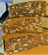 350 grammi di mandorle non pelate 350; 100 grammi di scorza d’arancia candita; 100 grammi di cedro candito; 150 grammi di farina tipo 0; 10 grammi di spezie miste (noce moscata grattugiata e cannella); 3 chiodi di garofano; 5 grammi di semi di coriandolo; 10 grammi di pepe; 150 grammi di miele millefiori; 150 grammi di zucchero a velo; 30 ml d’acqua; una ostia alimentare.